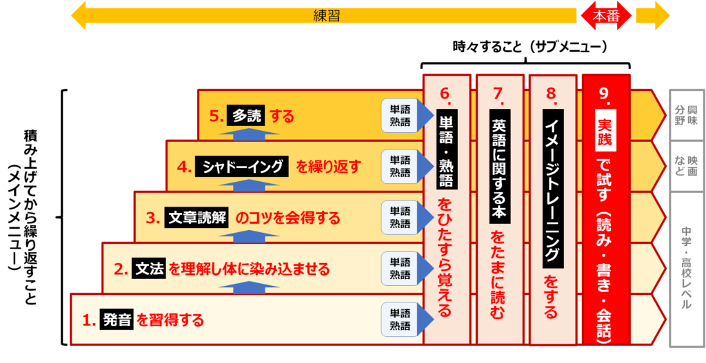ペラペラまで導く英語習得の道のりを1枚の図にしたものです。
